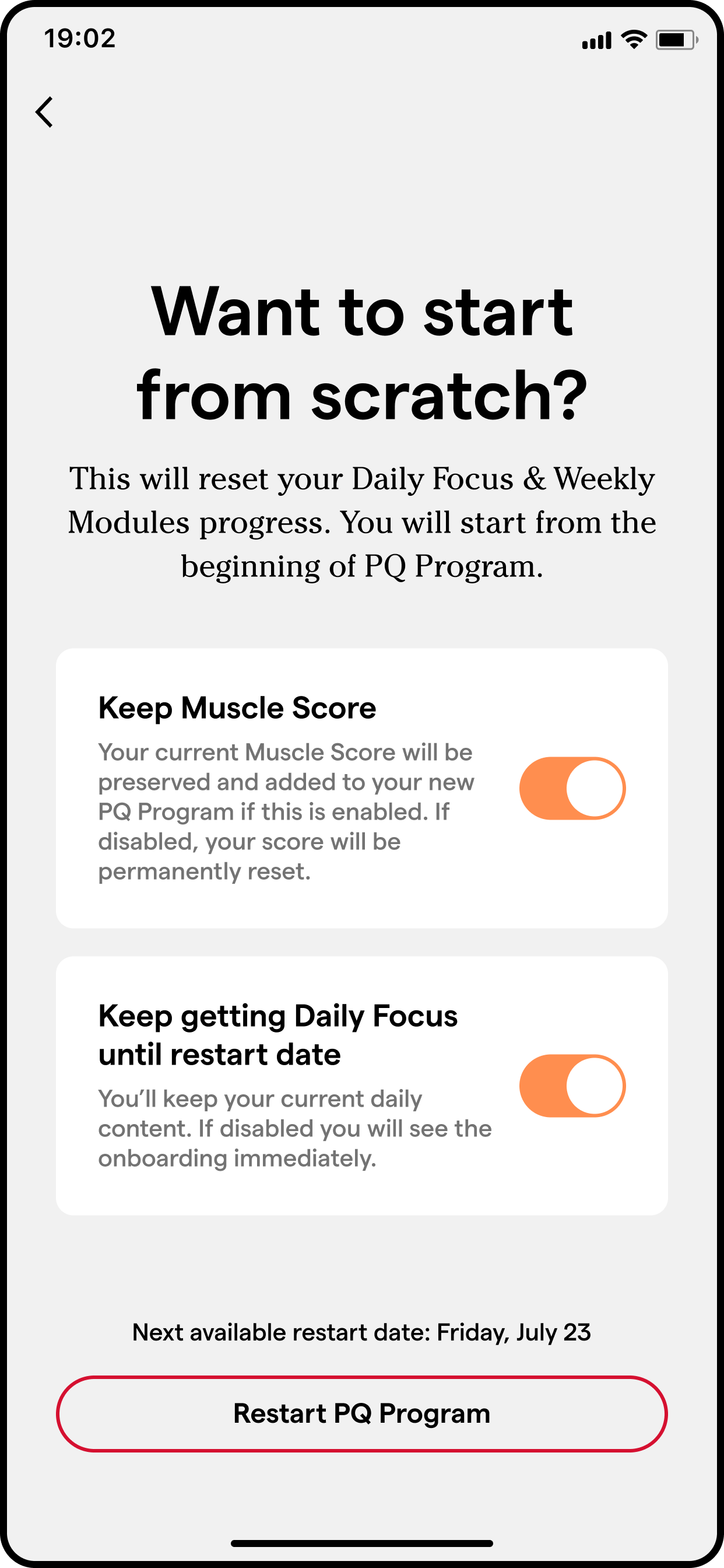 As a reminder, clients will not have the option that you do as a PQ Coach. If they want to restart their program, they would need to reach out to you to reset it in the Coach Dashboard.