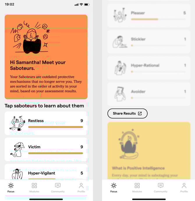 - For new users: We recommend taking the Saboteur Assessment. When selected, the assessment opens directly in a modal within the app.