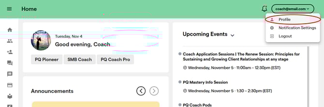 View and edit your coach profile by selecting Profile in the menu dropdown.